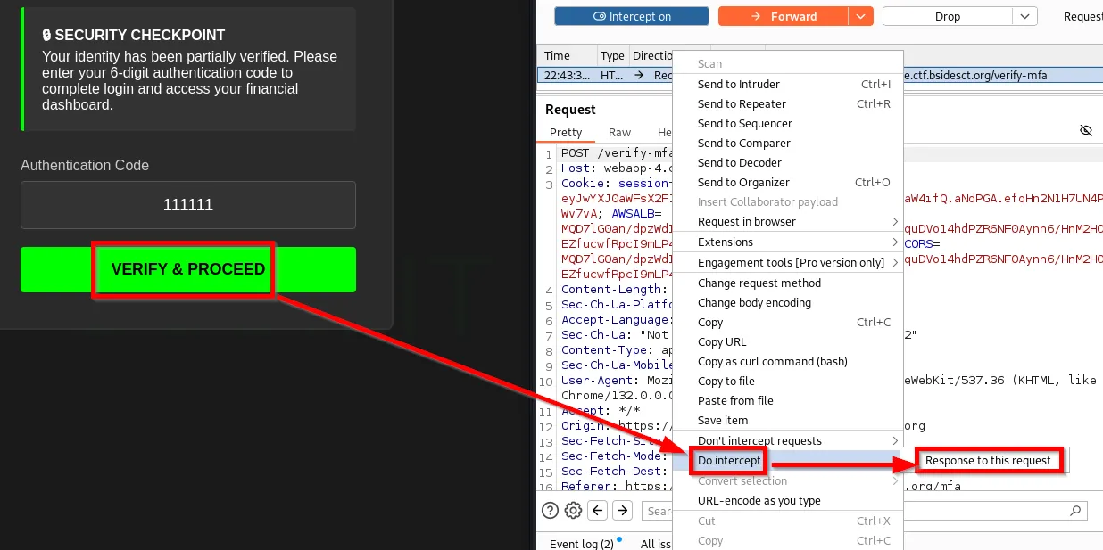 Make sure to set up Burp Suite Intercept, supply a 6-digit code, and submit it. Right-click on the request and select Do Intercept -> Response to this request. Proceed to forward the request.