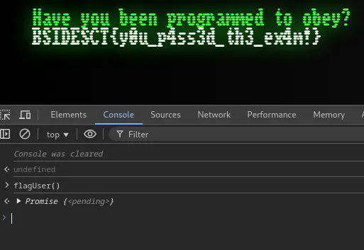 It will decode something for us. Going back to the application and right-clicking, we can go to Inspect -> Console and supply flagUser()