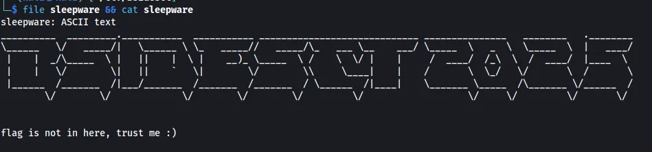 Looking at the file, we see that it’s just some ASCII art and a little message at the bottom saying the flag isn’t in the file.