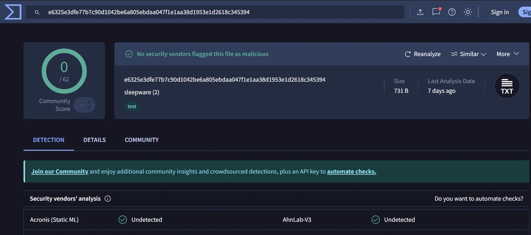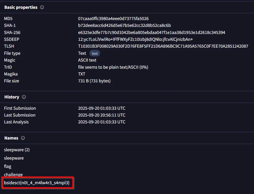 Looking at VirusTotal, we can see that there are 0 detections that this was actually malware, but when we navigate to the Details section, we can retrieve the flag.