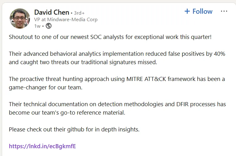 With this David Chen user, we can see that he posted something on his page about a new SOC Analyst who is posting some great content.