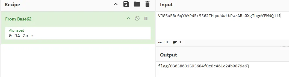 Throwing this into CyberChef, we can start looking at each Base decoding, and observe that when using the From Base62, we retrieve the flag.