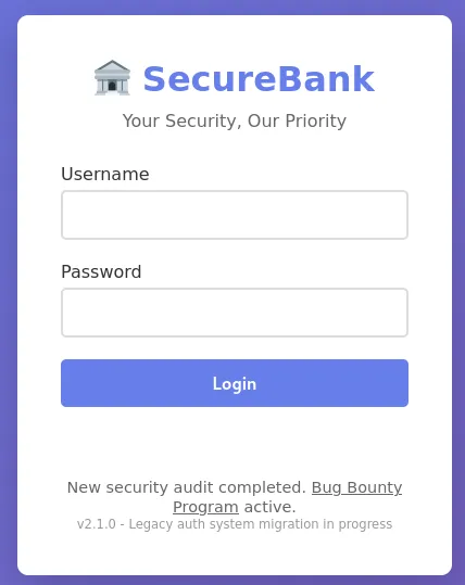 A banking portal with “legacy” code and forgotten endpoints. Something hidden waits behind the login screen. Find it. Break it. Claim the flag. Author: Kai