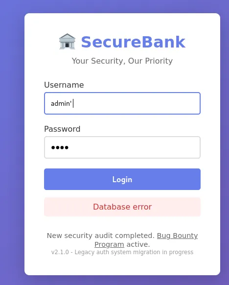 Trying various methods such as directory brute-forcing, inspecting the page source, etc., we see there’s not much we can do unless we’re authenticated. Sometimes, “legacy” sites will use default credentials such as admin/admin or admin/password, but that didn’t work either. However, after many attempts, adding a single quote to the username field resulted in a Database Error message being displayed.