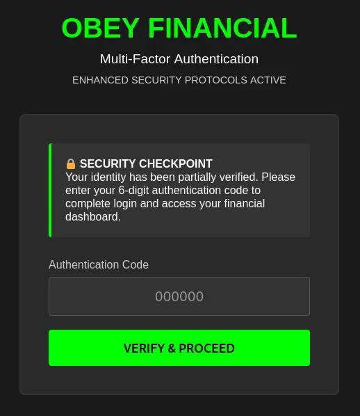 credentials onto the login page, we see that the user gets prompted with an MFA page. However, we don’t know the code to access the application.