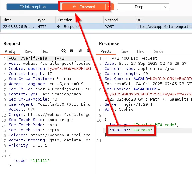 Make sure to set up Burp Suite Intercept, supply a 6-digit code, and submit it. Right-click on the request and select Do Intercept -> Response to this request. Proceed to forward the request.