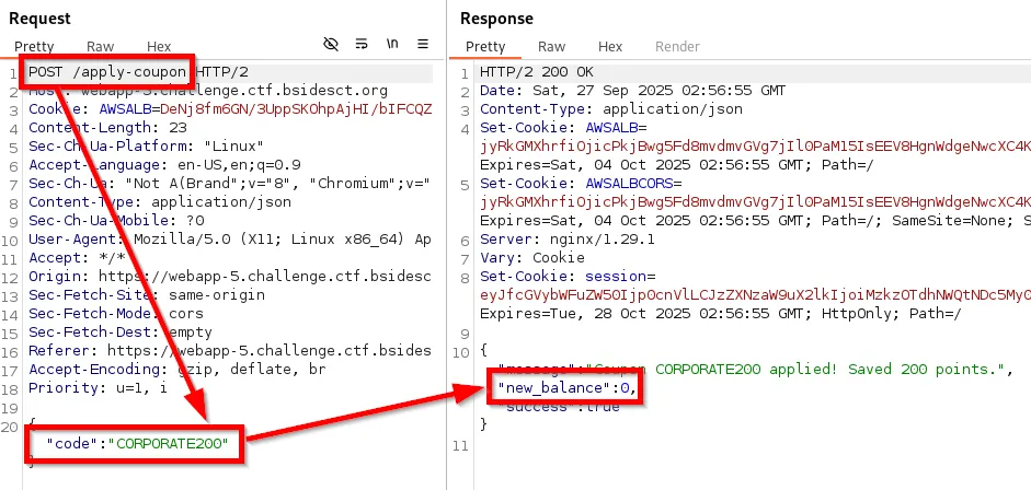 Since Burp Suite is running in the background, it is capturing every request that’s being sent to the server. Looking at the requests, we see that there’s an /apply-coupon