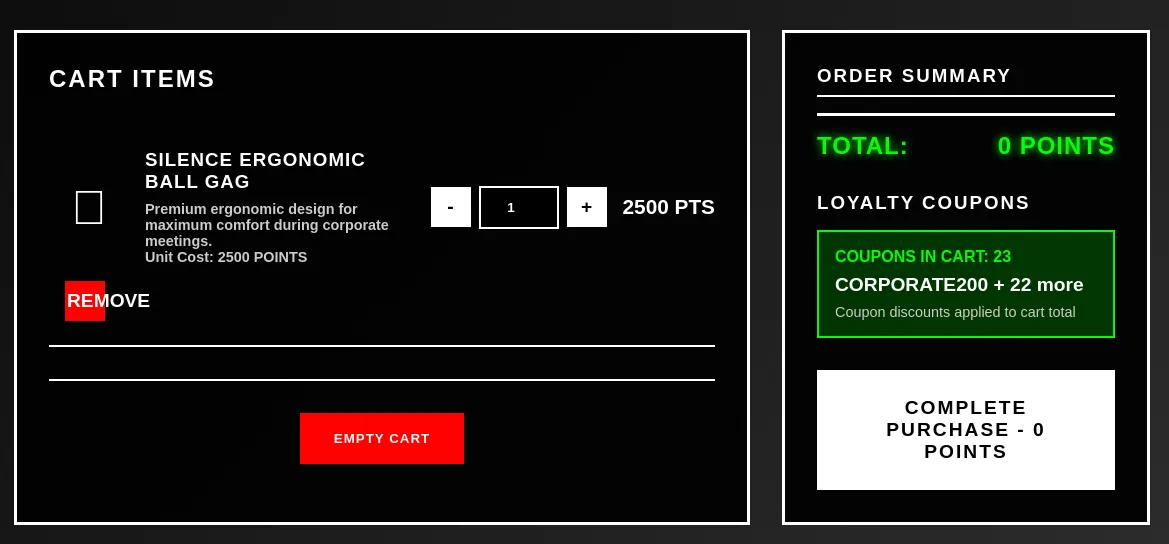 Going back to the browser, we can see that the coupon was applied numerous times, and we can complete the purchase.