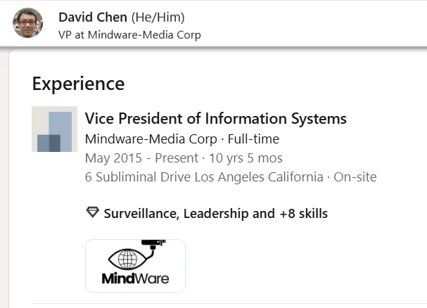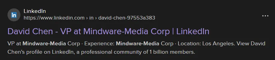 , where there’s a LinkedIn titled: David Chen - VP at Mindware-Media Corp