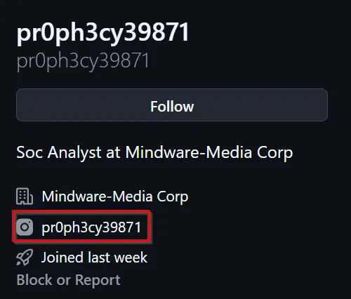 Clicking on the link in the post, we get redirected to pr0ph3cy39871’s SOC Analyst Insights Page. Looking around GitHub and going to the user’s page, we see that the user has an Instagram page attached to their GitHub.