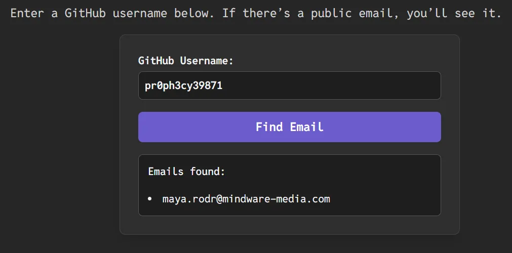 Since we have the user’s GitHub, we can perform a reverse lookup of their username to retrieve their email by visiting a website like Elliott’s DIY GitHub Finder Page. Supply the pr0ph3cy39871