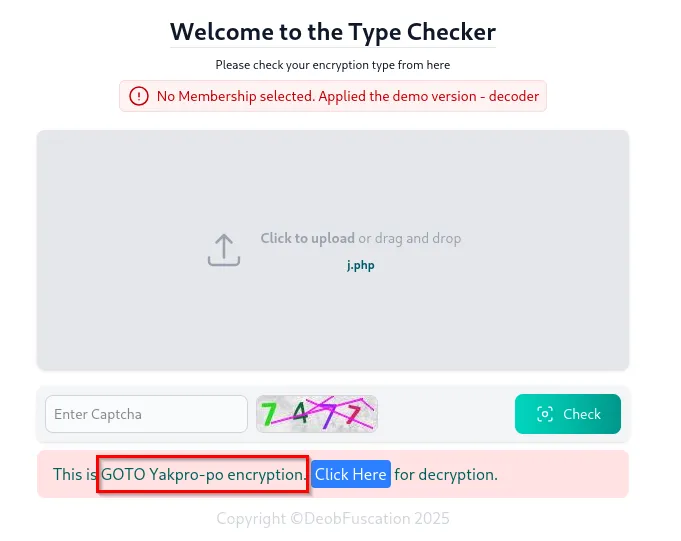 Looking up an Online PHP deobfuscator, we see one named Deobfuscation. Uploading the j.php file into the Type Checker of the website, we see the application has detected that this is GOTO Yakpro-po encryption.