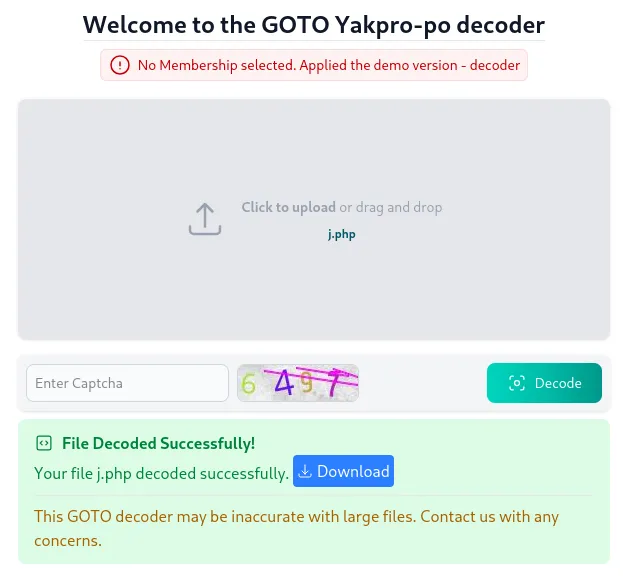 After navigating to the GOTO Yakpro-po, and uploading the file again to the application, we can see that it has been successfully decoded.