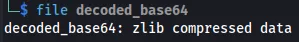 Doing a file on the decoded_base64 file, we can see that it is a zlib compressed data.