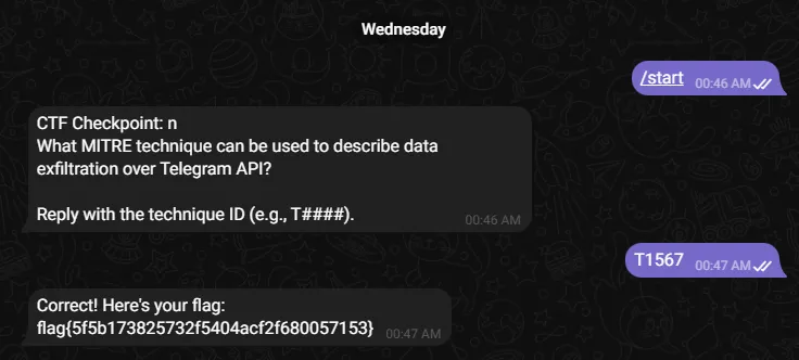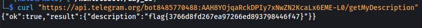 We are the st38l3r_botand can begin enumerating through the Telegram API. After looking at a few different API endpoints, it appeared nothing was working, until I stumbled upon /getMyDescription, one that shows the bot description. Running the following command returned the flag.