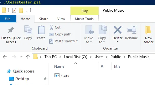 Running this script, an executable file will be stored on C:\Users\Public\Music\x.exe the Windows machine.
