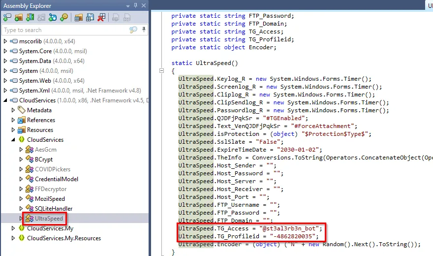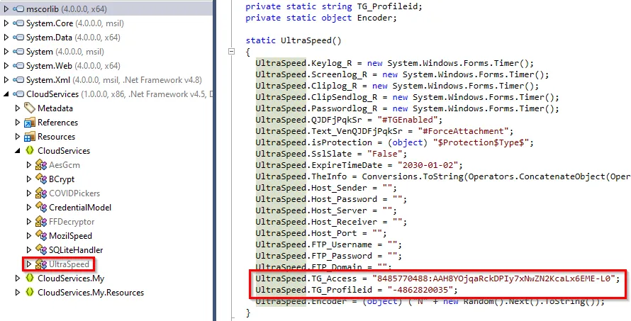 With this executable, we can load it into JetBrains DotPeek and begin looking through its classes and methods. Looking in CloudService -> UltraSpeed, we can see some sensitive information.