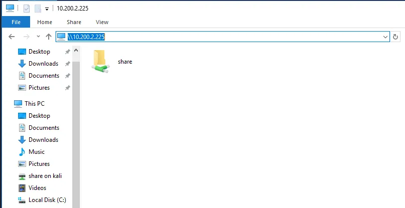 All this command is doing is creating an SMB share named share to the current working directory (which is where the RunAsTI64.exe file resides). In File Explorer on the Windows Machine, in the File Navigator, you can enter your VPN IP Address.