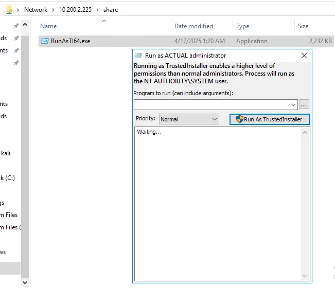 Going into the share folder, we see the RunAsTI64.exe executable. Double-clicking it opens the dialog box for entering commands.