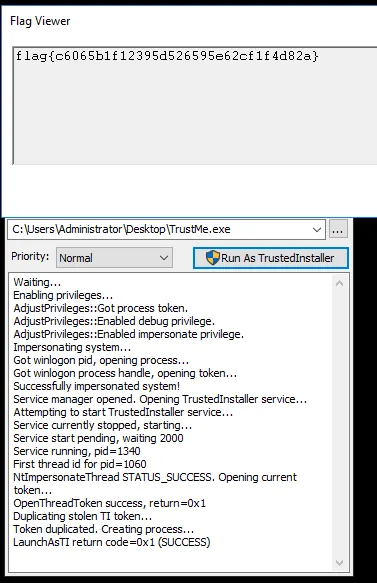 TrustMe.exeprogram on this Windows desktop “doesn’t trust me?”It says it will give me the flag, but only if I “have the permissions of Trusted Installer”…?