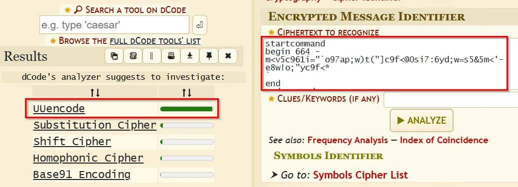 That looks like a weird string. What could that be? Going to dcode.fr, we see it predicts it’s a UUEncode.