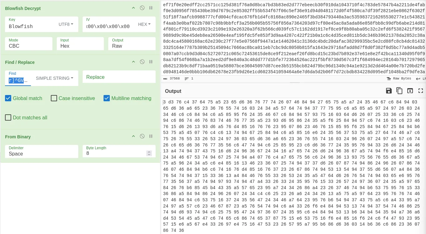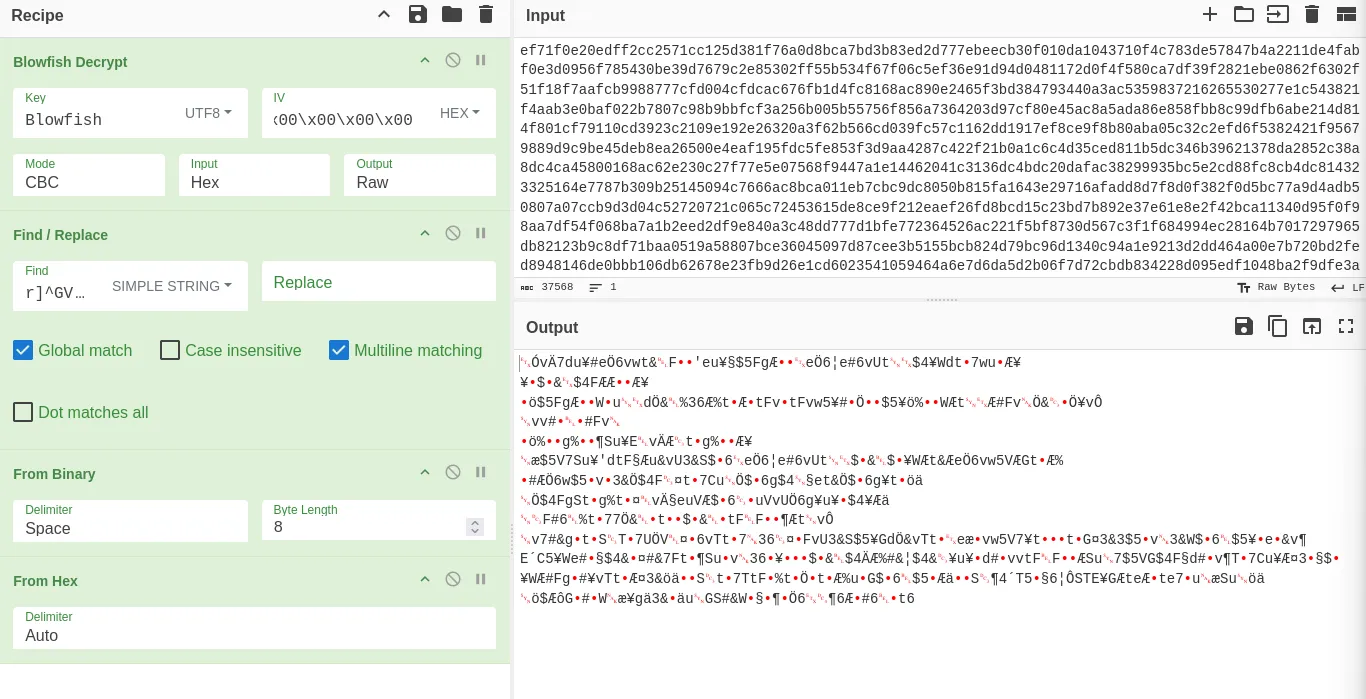 The decoded text that we get back looks like Binary. We can add the Find/Replace operation and remove the r]^GVXCX value from the output and put the From Binary underneath.