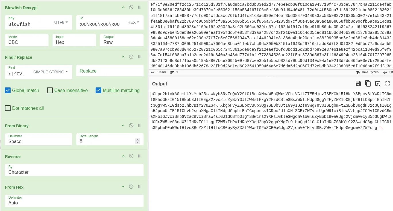 It appears to be a bunch of scribble. In the challenge description, there are HEX values that we can decode. Using CyberChef, we can decode it and see that it spells out Blowfish.