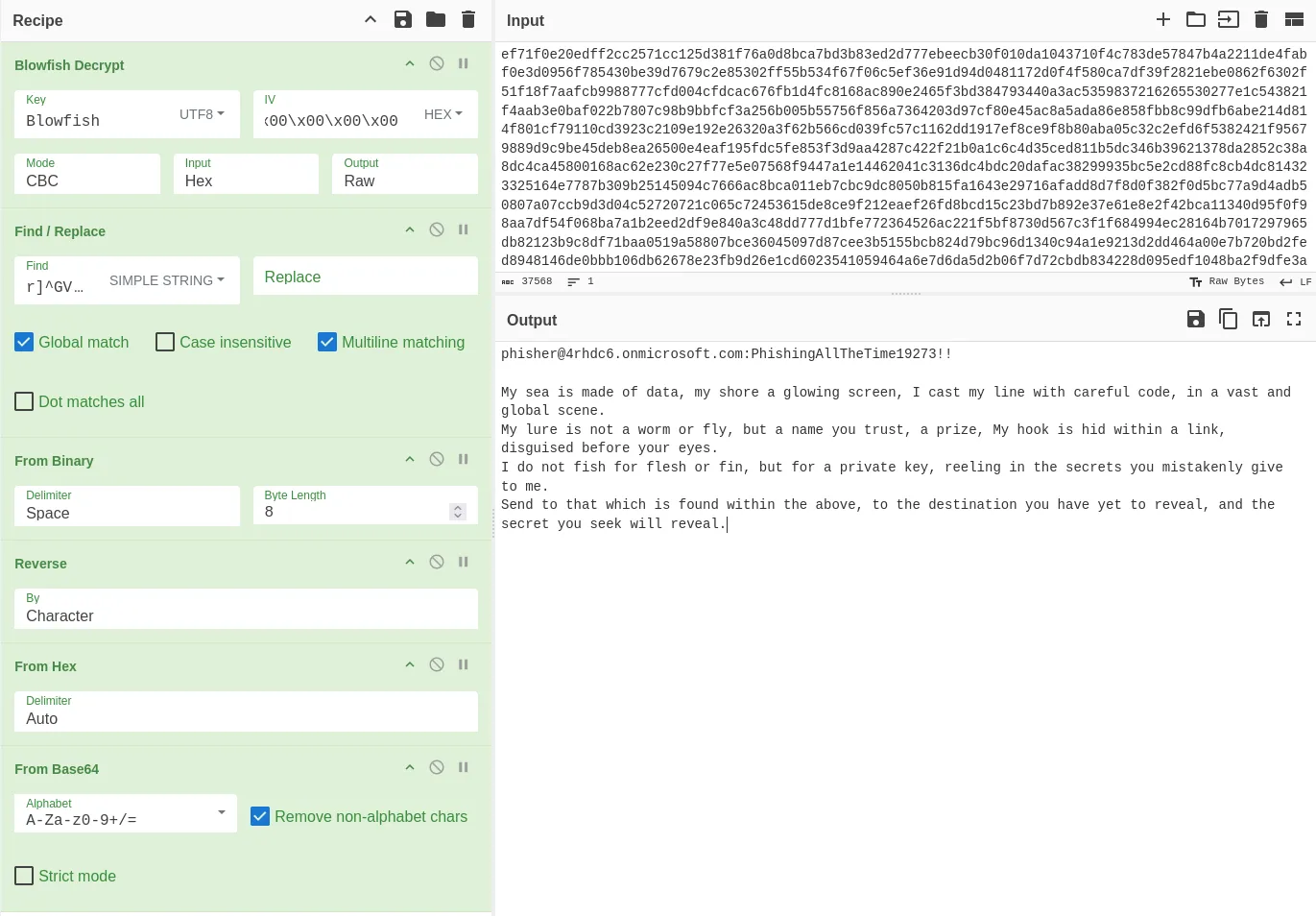 The string that the user is referring to is the string that we initially decoded, which is Blowfish. Mentioning Blowfish the the email reveals the flag.