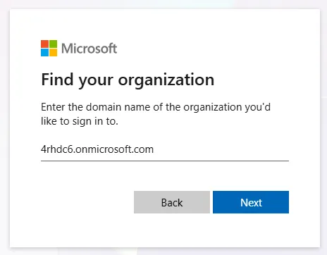 Next, we are prompted to enter the domain name. In this case, since we have the email address, the 4rhdc6.onmicrosoft.com is our domain.