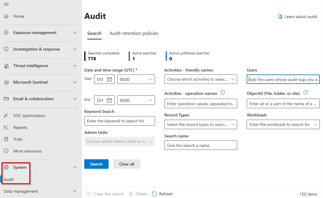This shows the Microsoft Defender panel. Underneath the System section on the sidebar, there is an Audit page, which shows different audits on the domain.
