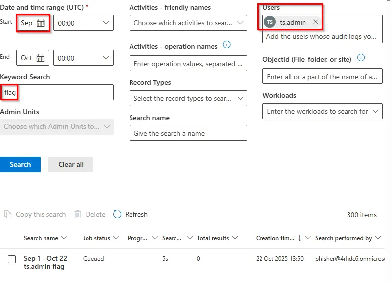 In the Users input field, we can supply the ts.admin user, set the date between September and October, and the keyword as flag. After all the fields are filled out, hit the Search button.
