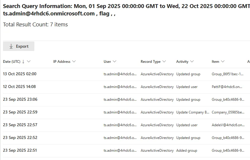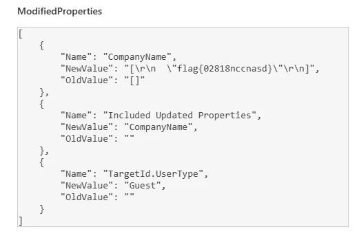 Looking through each entry, we see that on September 09, 2025, at 22:57, the CompanyName parameter was modified and has the flag inside.