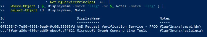 Get-MgServicePrincipal -All | Where-Object { $_.DisplayName -match 'flag' -or $_.Notes -match 'flag' } | Select-Object Id, DisplayName, Notes