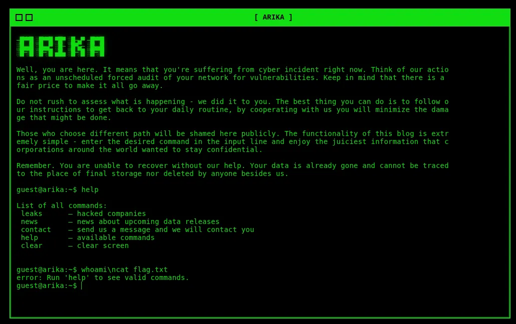 The Arika ransomware group likes to look slick and spiffy with their cool green-on-black terminal style website… but it sounds like they are worried about some security concerns of their own!