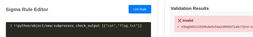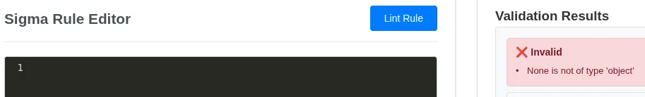 This is all the information we received about this challenge. Since this appears to be using only a YAML parser, we can assume it has something to do with YAML Injection. However, we don’t know what the backend is, whether it’s Python, Java, etc. First, I deleted all content from the Sigma Rule Editor, but I received an error message in the Validation Results pane.