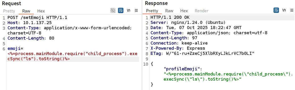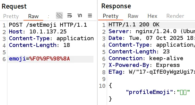 When a user submits a POST request to /setEmoji endpoint, their input gets stored in the profile.emoji variable. Additionally, the / endpoint reads the HTML and replaces the variable with the profile.emoji variable that is set in NodeJS. This profile.emoji variable is not sanitized for malicious characters before being set and rendered onto the page.