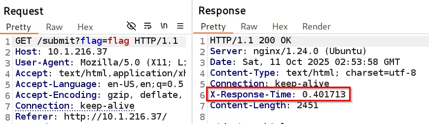 When attempting this challenge, I tried every rate-limiting bypass you could think of. I even installed an IP rotator to see if that would solve it, but it didn’t work. Additionally, as you can see, we can’t bruteforce the flag when we are rate-limited because the X-Response-Time goes back to 0.0.